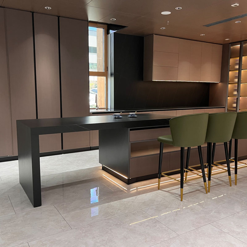 Qingdao Sinoya Co., Ltd. gir deg gjerne et L-formet luksuskjøkkenskap med glasskjøkkenskap.