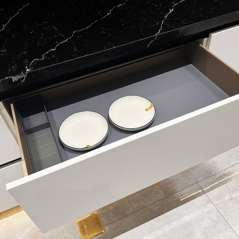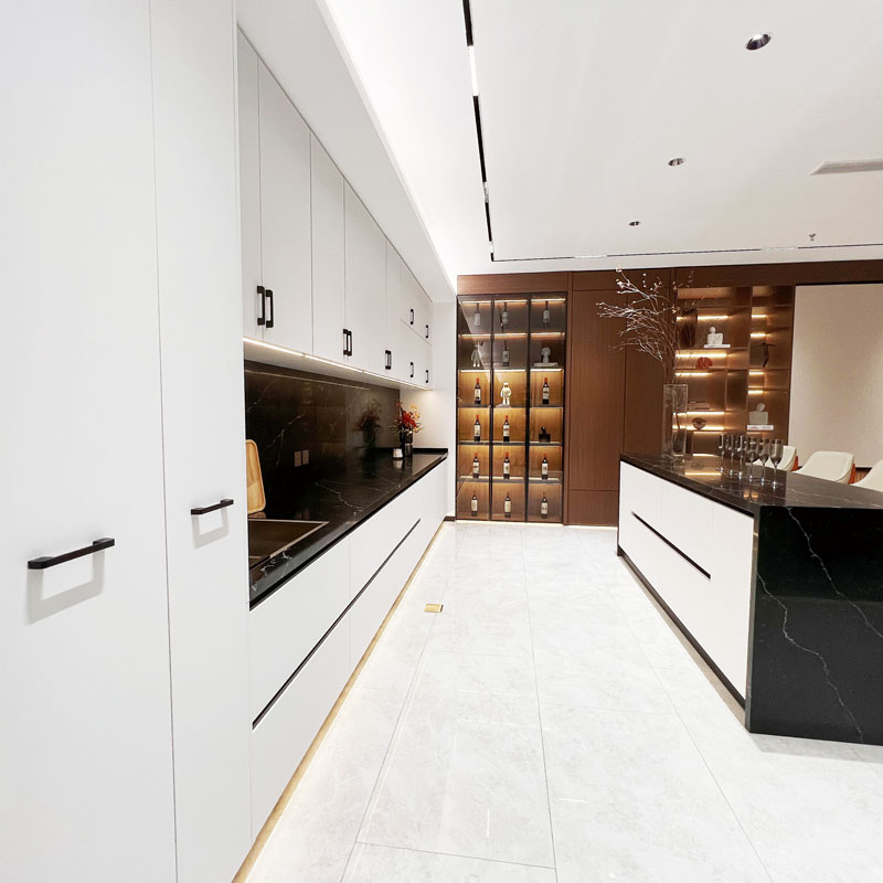 Denne serien med moderne hvite kjøkkenskap bruker en miljøvennlig overflatebehandling med hudfølelse. Grunnmaterialet til paneler er laget av høy kvalitet av furu som råmateriale med den tyskimporterte førsteklasses intelligente automatiske produksjonslinjen. Vi bruker kun MDI (4-diphenylmethane diisocyanate) lim; fenylen var flyktig under høytemperaturproduksjonsprosessen.
