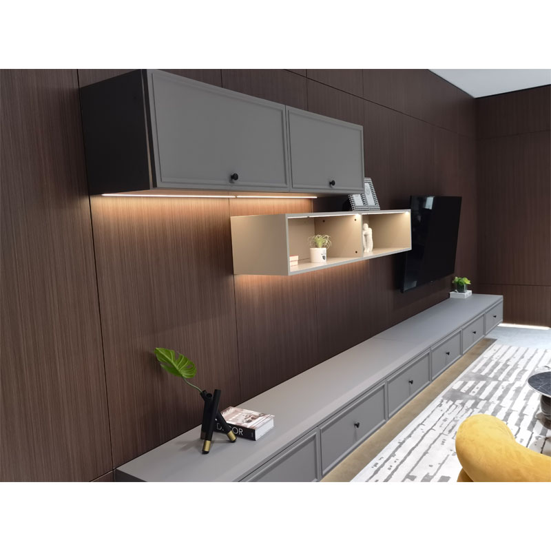 Vi anbefaler den beste typen for deg. Hvitt skapstativ kombinert med grå TV-vegg, er den mest populære kombinasjonen. Dessuten har PVC-materiale god lydabsorberende effekt, kan effektivt eliminere insekttrakassering for å forlenge levetiden. Dessuten kan SINOAH få malt skapets overflate, og legge til skyvedører med tilpasset form.