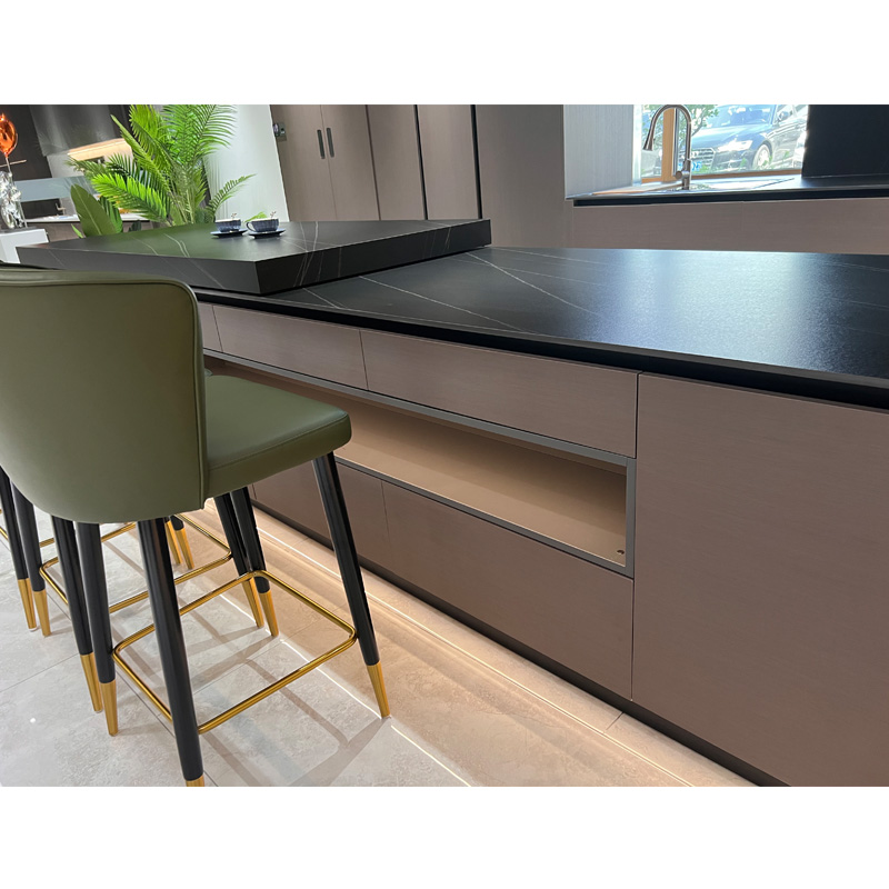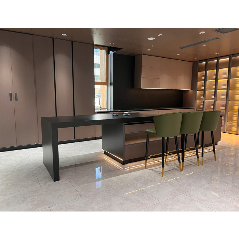 Disse smarte kjøkkenskapene i l-form og luksuskjøkkenskap med glasskjøkkenskap, de brune kjøkkenskapene og glasskjøkkenskapene passer fantastisk i design for å gi deg en lett luksusopplevelse når du lager mat. Pantry-skap er optimalisert for å inneholde alle dine kjøkkendresser .
