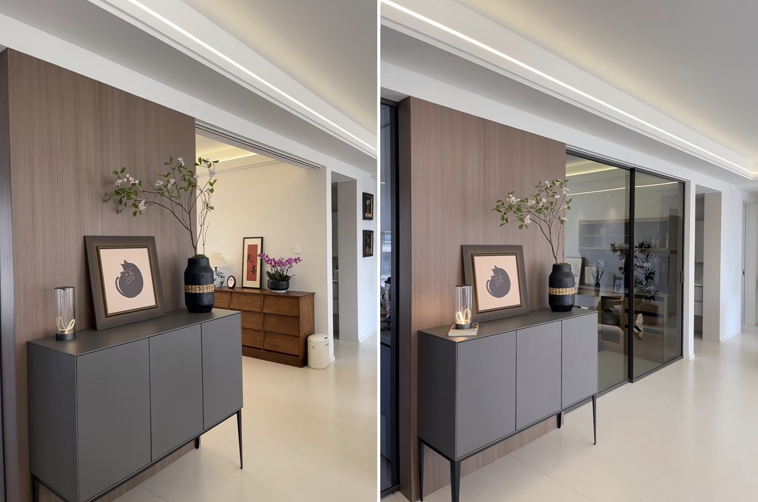Skyvedøren til balkongen og veggen med ett soverom er fjernet. Det revne soverommet har blitt omgjort til en studie, med en lommedør designet for å skjule døren når den er åpen, skape en åpen planstudie, og gi et privat rom når det er lukket, og gir fleksibilitet og allsidighet.